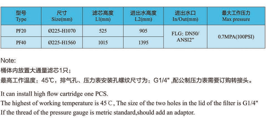 PF型大通量過濾器具有通量大、使用壽命長,及對復雜水質的操作性等優點,可廣泛應用于污水與廢水回用、海水淡化、電子等領域。整個過濾單元由兩部分部分:過濾器外殼及濾芯。